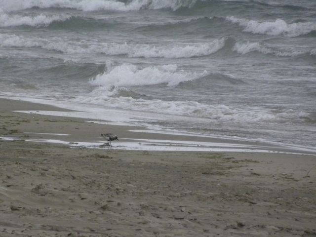 A careful sweeping survey of the mud flats turned up a distant Short-billed Dowitcher, several Lesser Yellowlegs and a handsome pair of Stilt Sandpipers. I found and enjoyed watching a couple of Semi-palmated Plovers, our only reasonably common small plover, and mentally compared them to the very similar though much paler Piping Plover seen in New Jersey last year and petite Snowy Plovers of El Salvador four months ago. These three plovers are all members of the Charadrius genus, a group that is distinctive in having a dark breast band or two, our common Killdeer is the most familiar member of the genus to us. Here are a few of my pictures for comparison (viewable only if you are logged in to My Bird of the Day, not if you’re reading this as an email.)