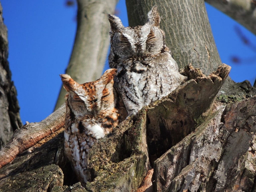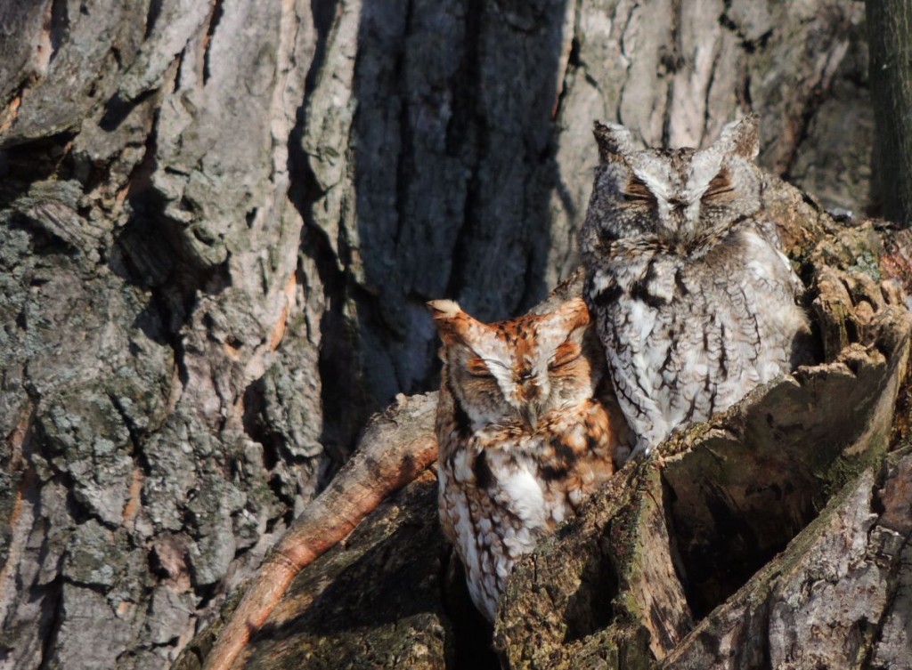 To help you interpret the picture of these two birds, I need to quote a local authority, Bob Curry, from his excellent book Birds of Hamilton and Surrounding Areas (Pub’ Hamilton Naturalists’ Club 2006): “The Eastern Screech Owls occurs in three colour morphs: grey, brown and red. Grey Screech Owls are by far the commonest in southern Ontario, these include the similar brown morphs that are seldom distinguished in the field or in museum collections. ….Red morph birds are less well adapted to cold and are commoner in the United States. Based on specimens in the Royal Ontario Museum….red morphs comprise about 19% of the Ontario population.