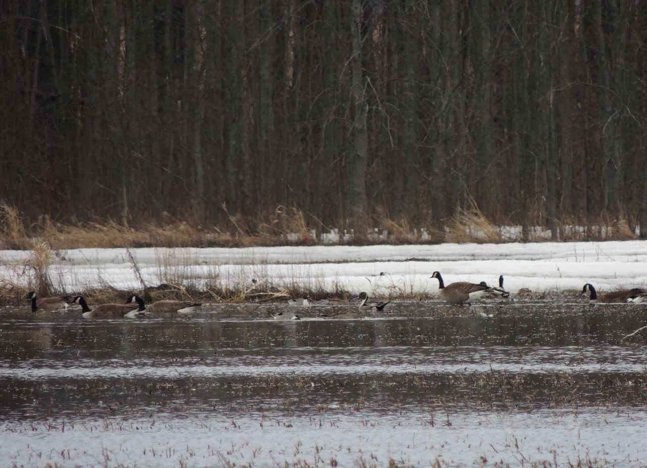 I spent an hour or perhaps two patrolling the iced-over or sometimes waterlogged farm fields looking for ducks and geese. It took a while before I found the right place, and when I did, I sat comfortably in my car scanning distant congregations of Canada Geese (by the hundreds) Mallards (plentiful), perhaps a dozen Northern Pintails, two each of American Wigeon and American Black Ducks and a solitary Tundra Swan. In this shot, (click on it to enlarge it) there are actually three pintails although two of them are quite hard to make out.