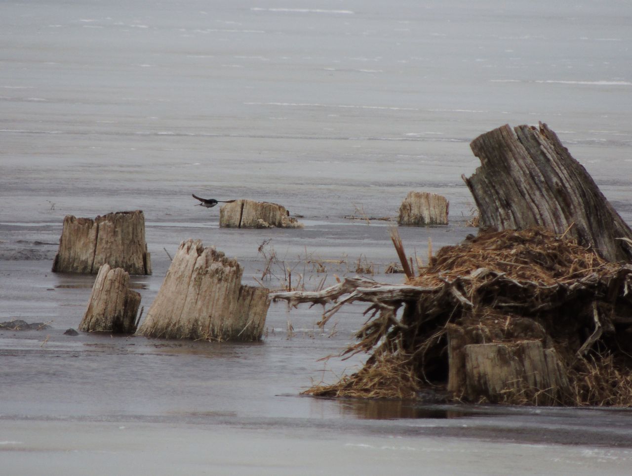 What made these birds extra special was that today is cold, close to zero degrees, and the lake was completely frozen over, but the swallows seemed to be finding food in the little puddles of melt-water. They wheeled around and dipped occasionally to pick at something, I assume it was food, not just a sip of water.