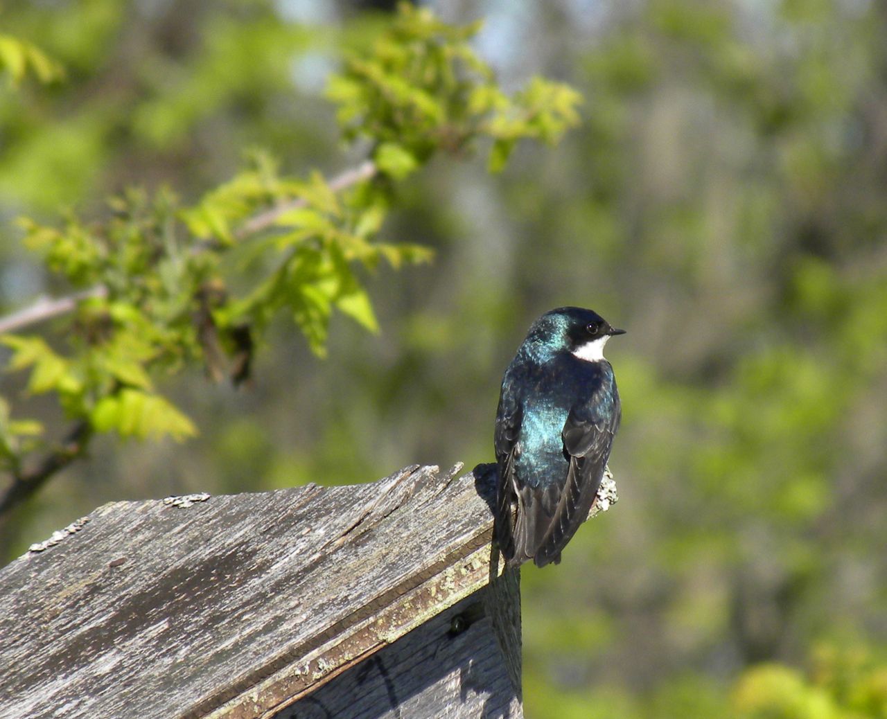 However at a stop on the shoreline of a lake, really a damm-made reservoir, where the habitat is right for Rusty Blackbirds, I spotted a small group of Tree Swallows. Tree Swallows are early returnees, they precede the other swallow species by several weeks and it’s usually cold, and to my mind too hostile for an insectivore, when the first spring arrivals show up. They are inoffensive, insect eating, nest box users and the males’ backs shine a vivid purple/green gloss; altogether a beautiful little bird. Here’s one from a warm spring day in 2010.
