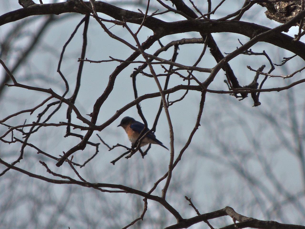 Bluebirds are rather difficult to approach; I’ve managed a couple of decent photos over the years but not today, unless you count this one, which is perhaps more artsy than anything. Shooting against a bright sky is always problematic, and trying to persuade the camera to focus on the bird rather than a branch is another challenge. I wouldn’t say I was particularly successful but well, it has its appeal.