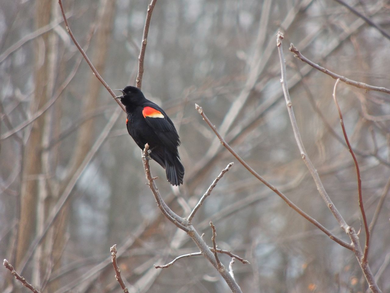 And then there were the Red-winged Blackbirds, male Red-wings arrive on our doorsteps almost as soon as winter’s ice starts to let go; they are one of the first signs of spring. The females arrive a little later allowing the males a couple of weeks to sort out their territorial claims. It’s an interesting process watching the males establish territories; the first to arrive will noisily claim ownership over an expanse of suitable habitat. As more males arrive they squabble amongst themselves, flashing their red wing patches, chasing and repelling each other, all to loud musical pronouncements. In time they divide up the whole area into territories defined like a jig-saw puzzle.