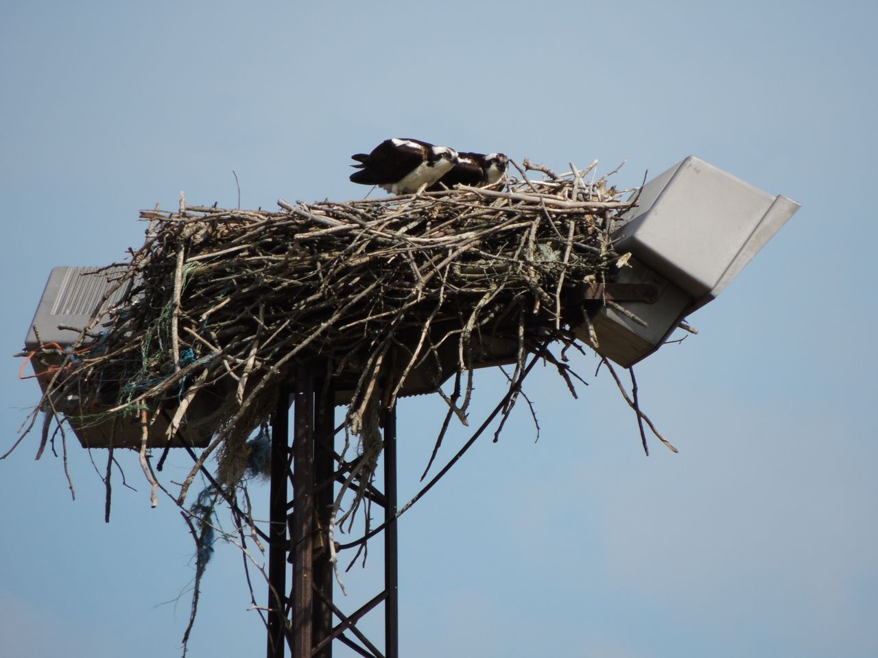 My search for Rusty Blackbirds took me past a dusty soccer pitch where, for many years, a pair of Ospreys has nested atop a floodlight structure.  Their overbuilt straggly nest survives from year to year and today, with the winter’s snow cover barely gone, both birds had returned and were crouching on it, facing into the wind and holding on. I watched for a while until one stood up, opened its wings and lifted off, in control despite the wind, going fishing.