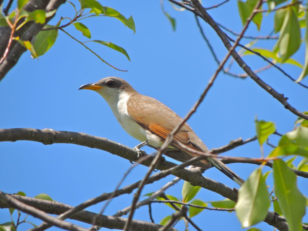 Both the Yellow-billed Cuckoo and its close relative the Black-billed Cuckoo, tend to be secretive, or at least stealthy, it’s easy to get confused distinguishing one species from the other, but whichever you find it’s always something of a triumph to see one. They prefer the canopies of forests so are a very special treat to watch at close quarters. Both cuckoo species are understated and tastefully dressed birds. A dash of chestnut in primaries and the yellow lower mandible set the Yellow-billed apart from its cousin.