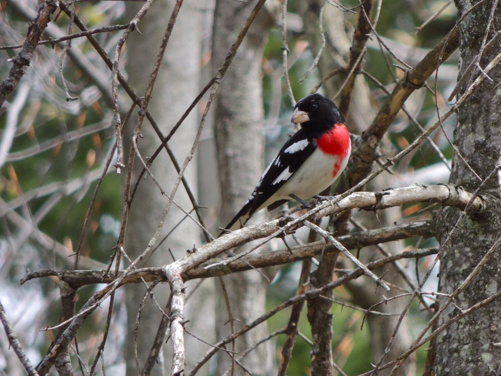 As I covered the last hundred meters of my walk, a male Rose-breasted Grosbeak emerged from a bordering thicket; always a notable bird. But this one was in the throes of molting out of its spring breeding plumage and taking on the drab browns and cream that are the dress-code of the females and young. I’ve include two photos: today’s bird (above) and another very splendid male photographed just two months ago. All that molting effort (it demands a lot of energy to grow a new suit of plumage) is invested into the bird’s two or three most important months.