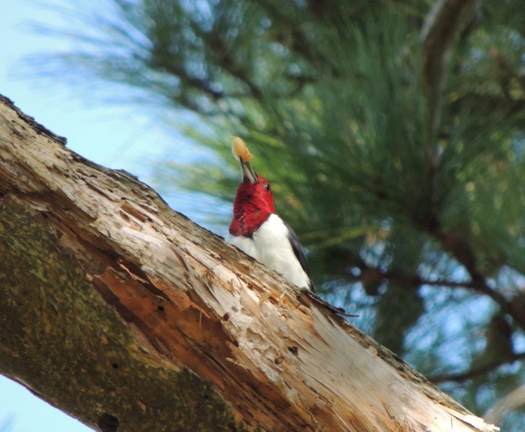 Today I walked this same wooded trail again, noting those same woodpecker trees although this time there was comparatively little sign of bird life. Little except, sensationally, for one Red-headed Woodpecker hammering away at a decaying pine branch very close to where I had left them two years ago; it only takes one Red-headed Woodpecker to redeem any number of other let-downs, disappointments and omissions so I was quite thrilled by it and I suppose it’s quite possible I was looking at one of the same individuals. If it made Bird of the Day in October 2014 why not in October 2016. On thinking about it, it’s quite possible I haven’t seen a single Red-headed Woodpecker anywhere else since then. I don’t suppose for one moment that it feels that same sense of Hail Fellow Well Met that I do. But there it is, I’m just another tourist passing by and we’re hardly an endangered species.