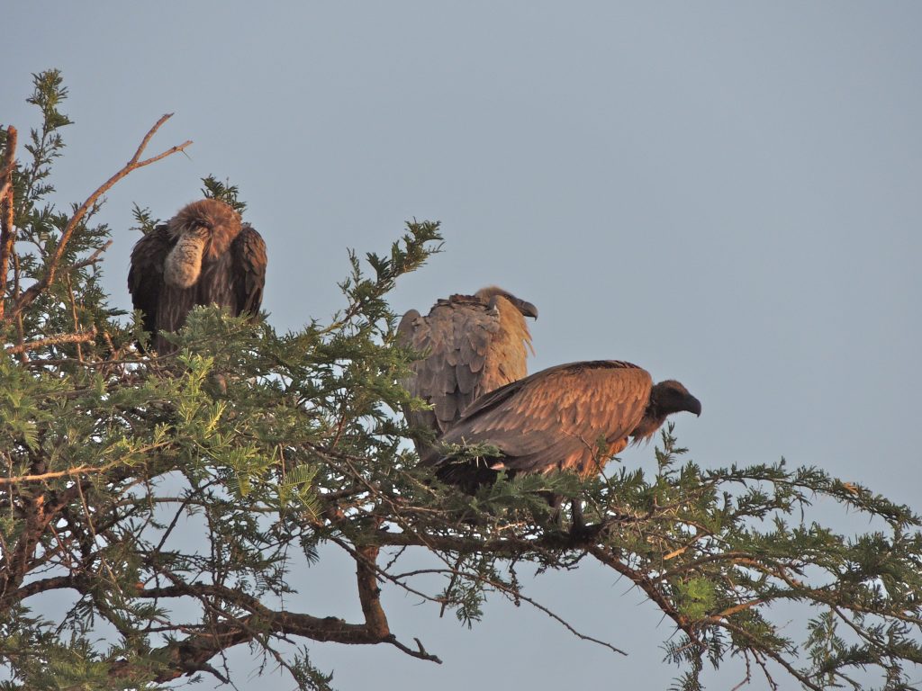 The scene would probably be incomplete without some vultures hanging around nearby. Fortunately it didn’t take long for my guide Robert to point out a classically hunch-backed group loafing on a suitable flat-topped tree; they were waiting for something meaty to come to an unhappy ending I suppose. From the comfort and safety of our Land Cruiser we determined they were African White-backed Vultures. Lions and vultures, what could be more fitting?
