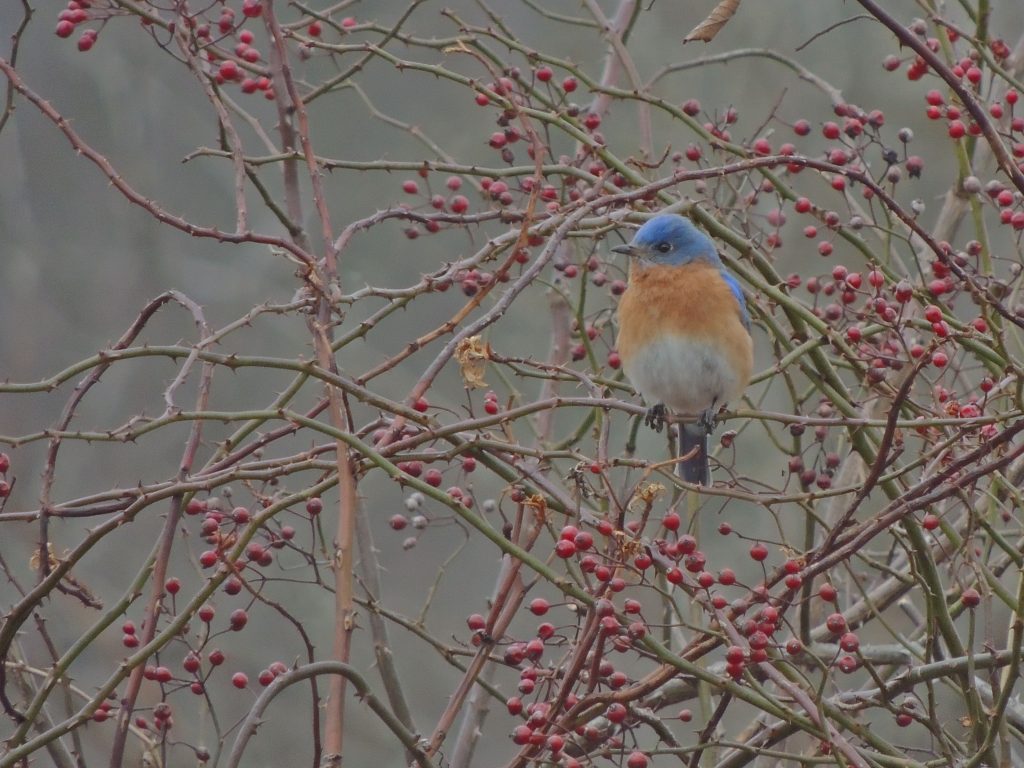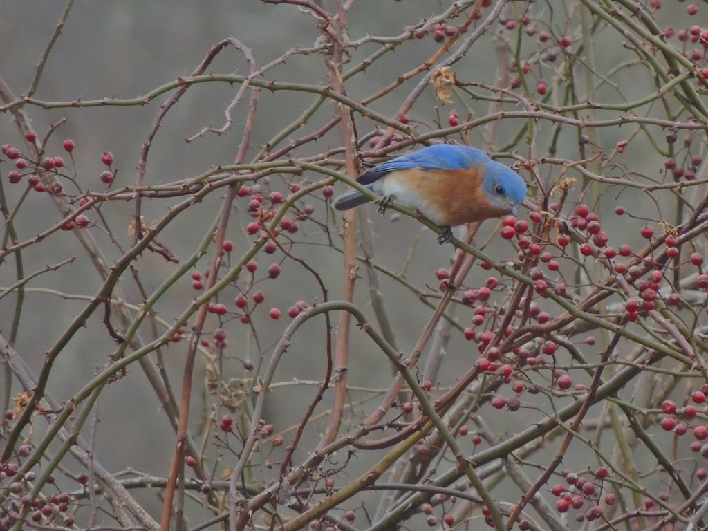 Today’s random pop-up was an Eastern Bluebird, actually a pair of them. I had been hiking a long and, at times challenging, woodland trail with steep hills and patches of ice (a nasty combination). The trail eventually opened up to a grassy old orchard dotted with patches of Multiflora Rose, it was where several trails came together. Just as I was thinking that it was the right sort of habitat for bluebirds or maybe even a shrike, and making a mental note to come back in a couple of months, a small bird flew up from the edge of the path to an overhanging branch. A quick binocular look and there, as if fulfilling a prophesy, was an Eastern Bluebird, it made my head spin for a moment. As I debated whether I could make any photographic sense of it, it flew to one of those clumps of Multiflora Rose taking its mate with it. That was an improvement as it was now close enough to be able to get several decent shots. It’s hard to imagine a more subtly beautiful bird than this, there are many equally beautiful, but how could anyone improve on this little thrush? (Yes, a thrush.)