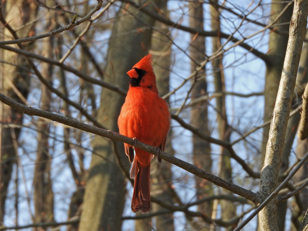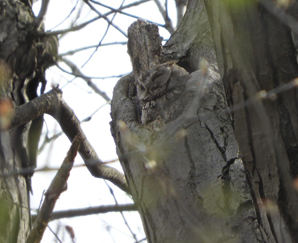 But, as the heading suggests it was an Eastern Screech Owl that stole the day. In the clamour of bird song, we were trying to separate Northern Cardinals from Carolina Wrens, Black-capped Chickadees, European Starlings and Red-winged Blackbirds from everyone else when a small background sound caught my attention: a low tremolo, familiar-ish but out of place; it was there for a moment and gone, only a whisper so I had to let it go. Minutes later I heard it again and was able to get Lyn to give it her attention, although at first she couldn’t help. We moved towards it and kept working and trying until somehow the sound moved to the foreground. It could only be a screech owl (unlikely during daylight hours) or perhaps a woodpecker drumming on a particularly resonant branch (plausible but a weak option). As I listened; Lyn scrutinized likely trees with possible nest cavities and then came a little exclamation, found it! Then took her binoculars off it and had to search all over again. But there it was, an Eastern Screech Owl overseeing the world around it and singing along, Bird of the Day.