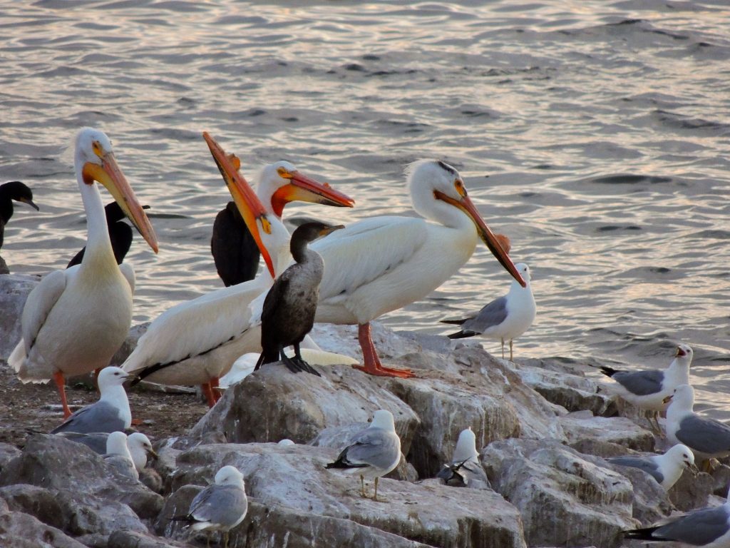 Moving on from that rather intoxicating moment we were soon at water’s edge trying to disentangle and identify swooping Barn Swallows, Tree Swallows and Northern Rough-winged Swallows when Alex, a little overwhelmed by it all, gestured up and asked, “And what’s that?” ‘That’ large, white bird with black and white wings, and an oversized, orange-billed head was an American White Pelican, unmistakable, improbable but as large as life. So why a pelican here? Simply because after they spend winter around the shores of the Gulf of Mexico they have to they pass over us on their way to breed in north-west Ontario and across Manitoba, Saskatchewan and Alberta. Still, en-route or not, a pelican overhead in Ontario in May has to be Bird of the Day; and that made two within twenty minutes.