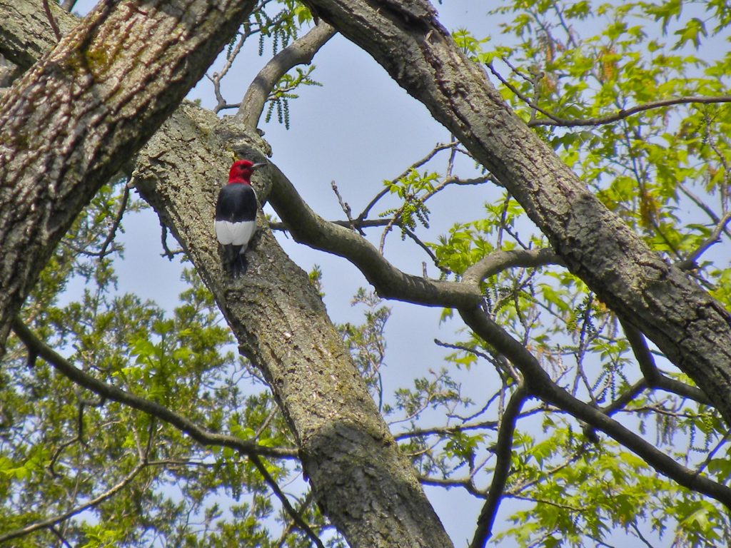 Starting one of our usual transect routes we soon had a handful of Yellow Warblers, American Robins, American Goldfinches and Northern Cardinals singing within earshot . In no time we were celebrating seeing a Blue Gray Gnatcatcher, and hearing Carolina Wrens and Rose-breasted Grosbeaks. My companion, Alex, caught sight of a largish bird flashing black and white as it flew from treetop to treetop and pointed it out. My first thought was Rose-breasted Grosbeak but hardly were the words out of my mouth when I saw big blocks of black and white that made it a Red-headed Woodpecker, a spectacular and sensational sighting in southern Ontario. The photo below shows those big blocks and you can easily see why its folklore names included Half-a-shirt, Shirt-tail Bird and Tri-colored Woodpecker. and Alex may have wondered why I was so jubilant, but it’s a species in decline so all sightings are precious and Bird of the Day without doubt.