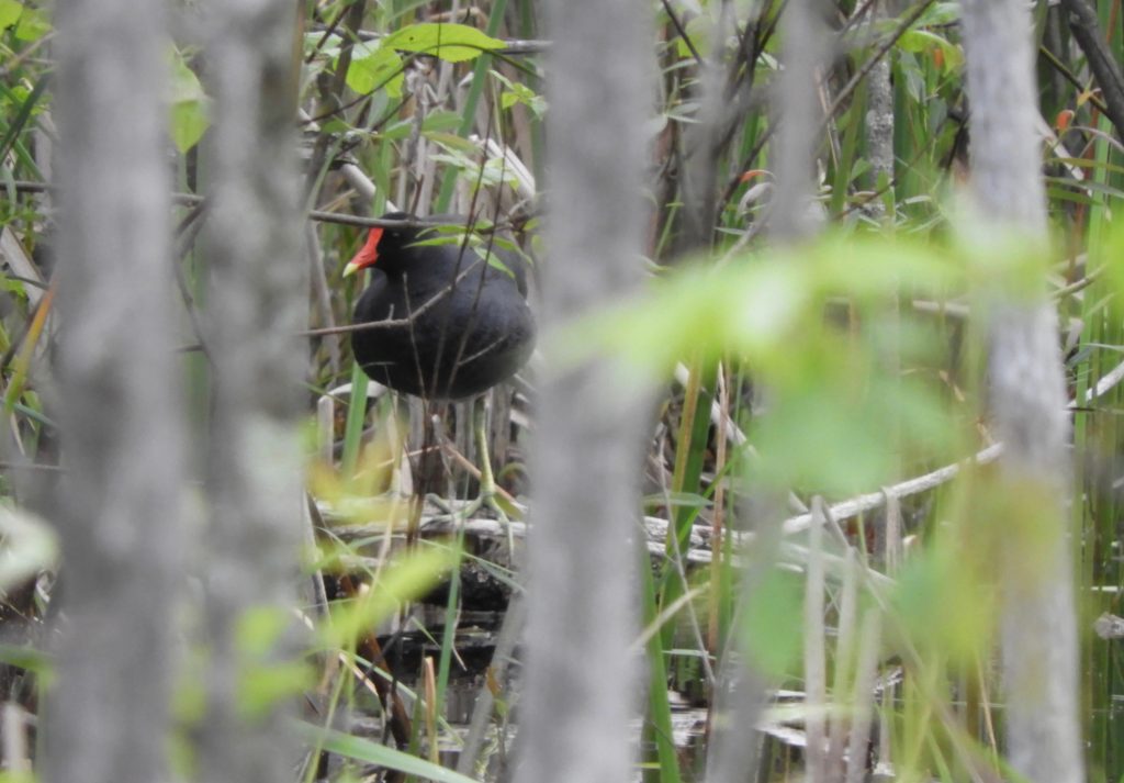 And there, well the headline gives it away, peering back at me was a Common Gallinule. A blackish, duck-like bird with a red frontal shield. Here it is, Bird of the Day for any number of reasons.