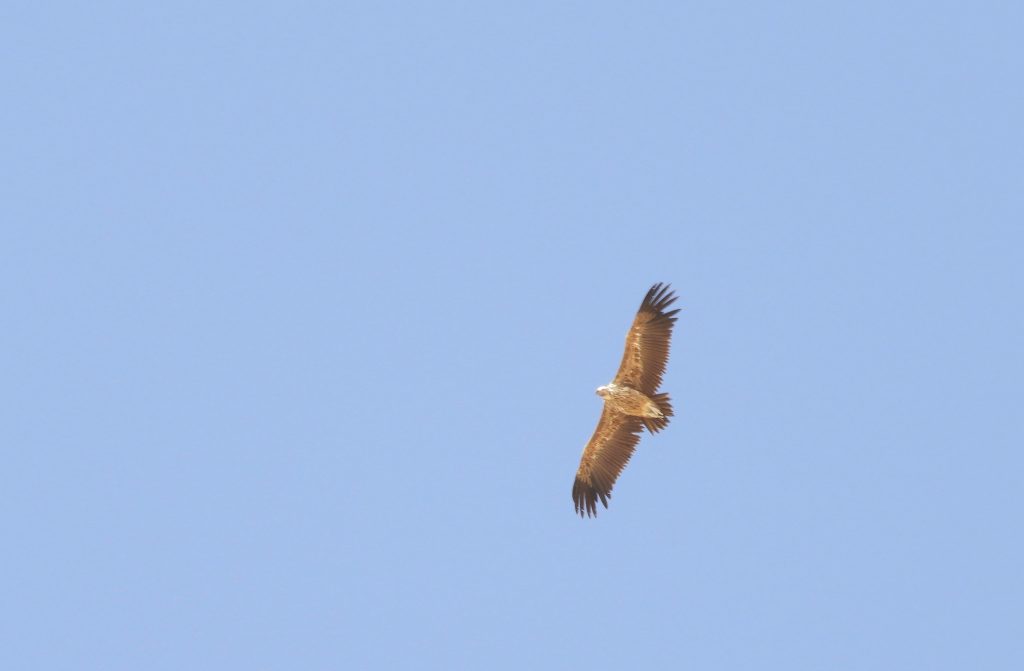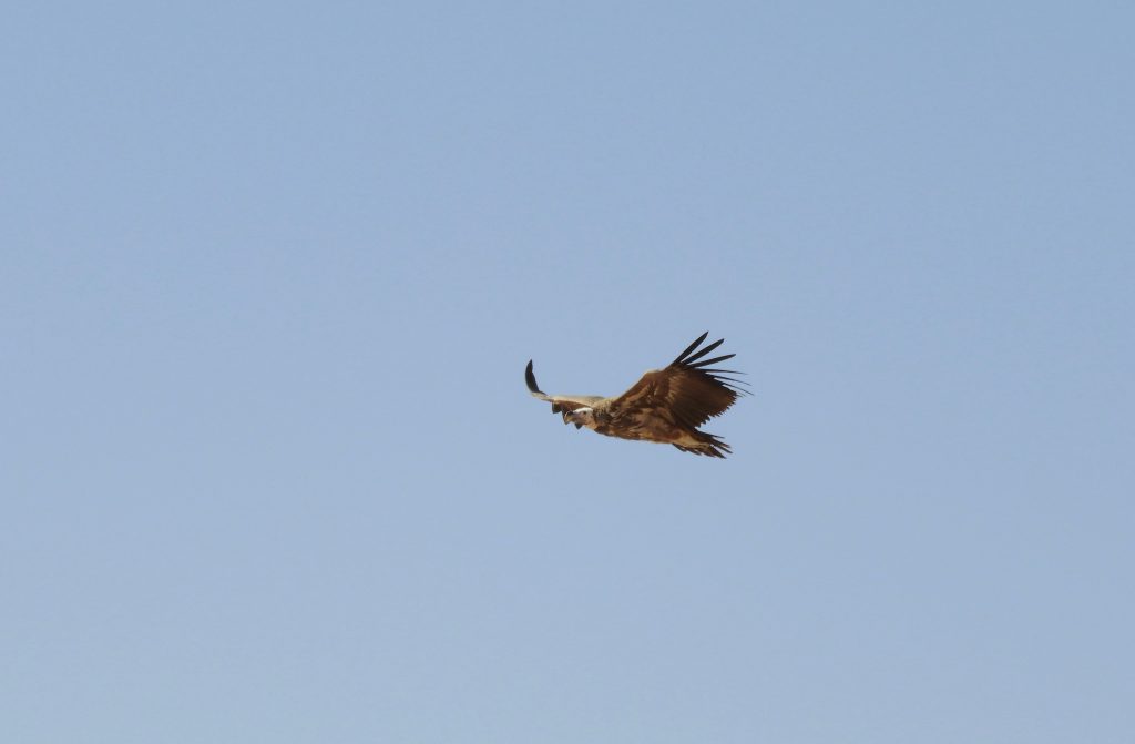 As we paused for lunch, I spotted a couple of large birds airborne and far from us and above the horizon. They drifted rather than flew and had the profile of large planks, wings slightly downward tilted from the horizontal. Lappet-faced Vultures! I called out with fingers crossed, although that was just about all they could be based on the species list we had received; and they were! They came closer, drifting in large circles until one passed almost overhead. Unmistakably vultures with heavy flesh-tearing beaks, wrinkled bare heads and wings made for effortless soaring. They circled the valley to our left where the white skeletal remains of Oryx dotted the sand floor. There is no mammal top predator left in the Arabian Desert to cull and devour the weak and infirm, Lions and Leopards are long gone so, I suppose Oryx and gazelles must just fade away. Wherever possible, their carcasses are transported to the nearby valley in an effort to attract the vultures; apparently it works.