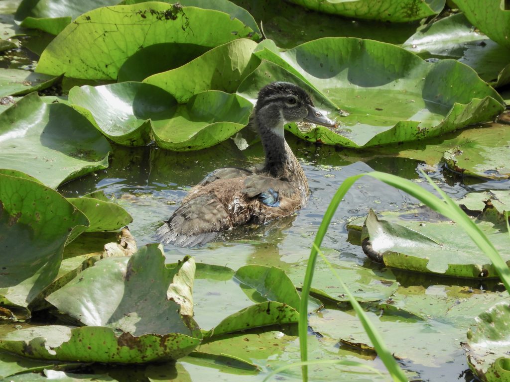 Royal Botanical Gardens. Hamilton and Burlington ON. August 17 2020. I have been following the fortunes of a Barn Swallow nest over the past couple of weeks, it is located under a pond-side viewing platform . The platform is a good birding place to linger, it has a long commanding view of the pond to a far, dark forested bank. The pond itself is a sure place to find Wood Ducks, Mallards, Great Blue Herons and Belted Kingfishers and its edges are thick with Cattails (aka Bullrush or Reedmace in other parts of the world) and more recently Wild Rice has become established. A week ago, I photographed this young Wood Duck just a few feet out from the platform.