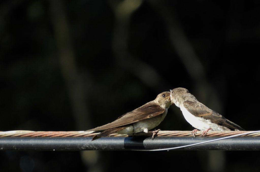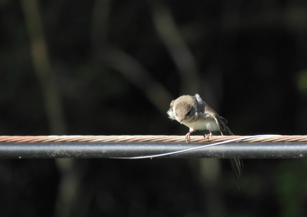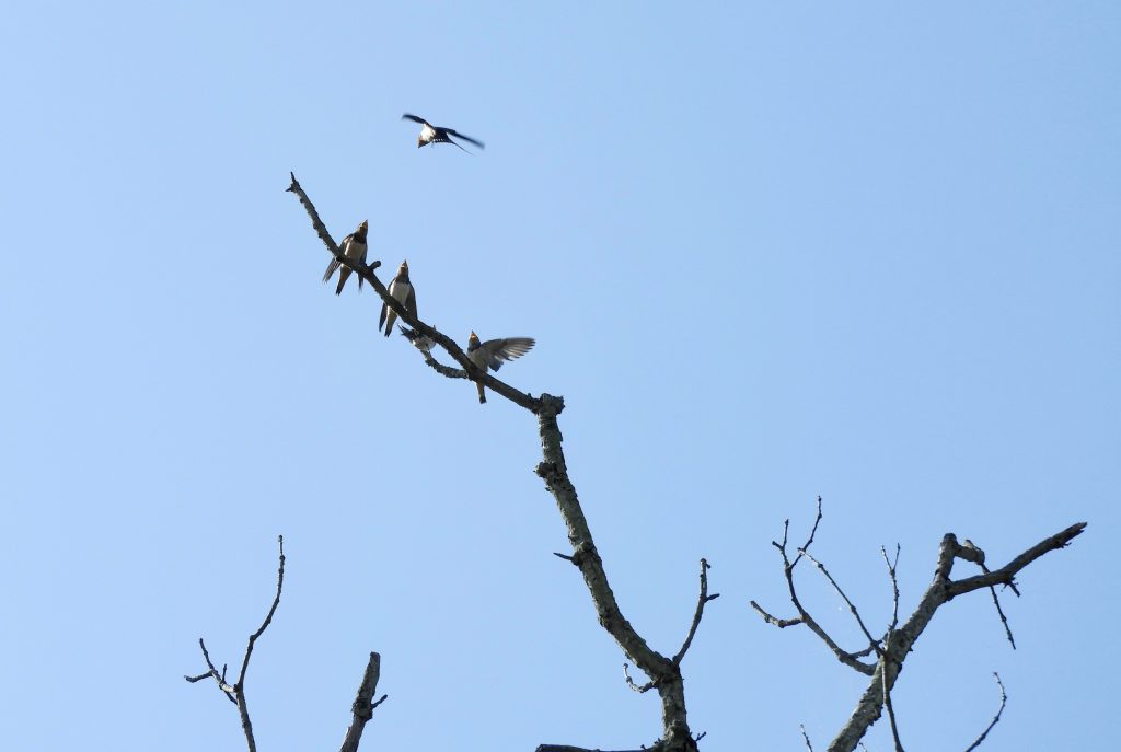Back to the Barn Swallows. A pair has nested under the platform for several years, always in the same spot. The presence of the nest only becomes evident with the endless coming and goings of the food-carrying adults. Two weeks ago, I noticed they were delivering food again so probably to their second brood of the year. It takes about five or six weeks to complete the full nest-preparation to fledging cycle so they could have started on today’s brood in early July. So, it’s possible that they had already raised (or at least tried to raise) an earlier brood here starting in mid-late May, shortly after arrival. Anyway today, the latest brood were lined up on a bare branch above the platform, waiting for food.