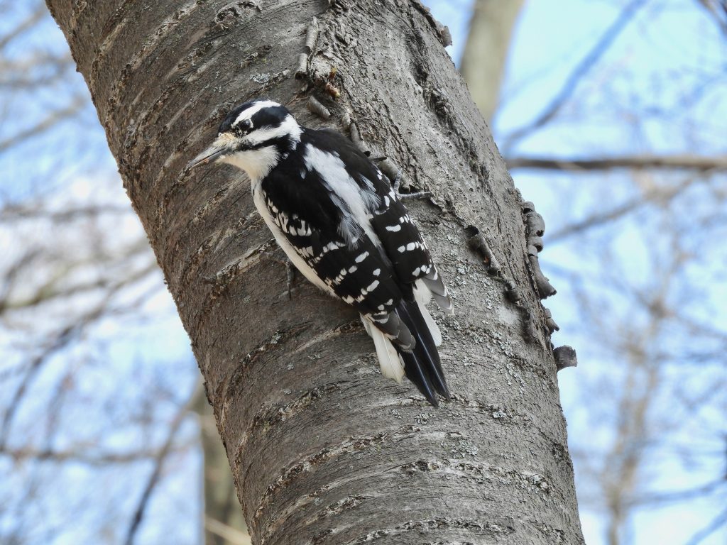 Snake Rd, Burlington ON. March 20th..2021. I went to one of my favourite woodlands this morning, looking for signs of spring. It’s a quixotic exercise in mid-March but I want to make sure I don’t miss anything and the reality is that animals, rather than plants are the first to declare the season, green shoots will follow in a week or two. Perhaps the nicest sighting was a fast-moving butterfly, a Mourning Cloak. I know almost nothing about them except that they are always the first butterfly to appear, and typically in open deciduous woodland where there may still be snow on the ground, just as I saw mine today. They are very attractive: quite a large butterfly, mostly chocolate brown with a line of purple/blue dots along a creamy white band along the trailing edges of their wings. It is a noteworthy ‘winter’s gone’ sighting and it really made the grade as a sign of spring, but one butterfly does not make a spring and that’s where the Hairy Woodpecker comes in.