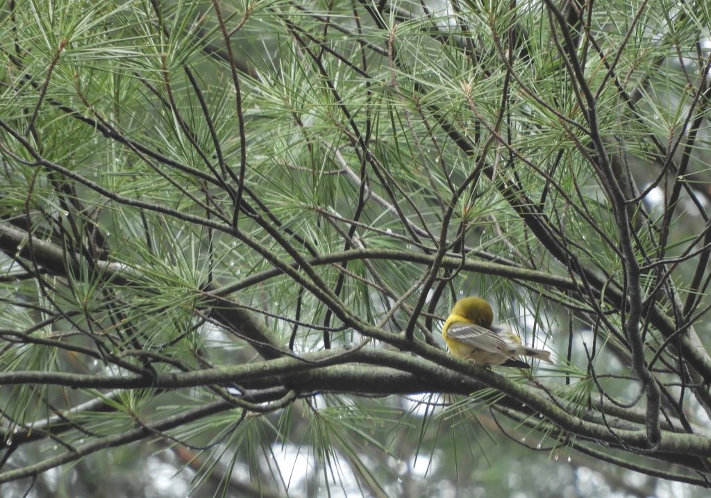 But it wouldn’t go away, that trill, it grew louder and more certain and in time I could see a fluttering speck of yellow, busy against the sombre green of a pine. It really was a Pine Warbler and the longer I watched the closer it came and, bless it, was content to linger long enough to allow some photos.