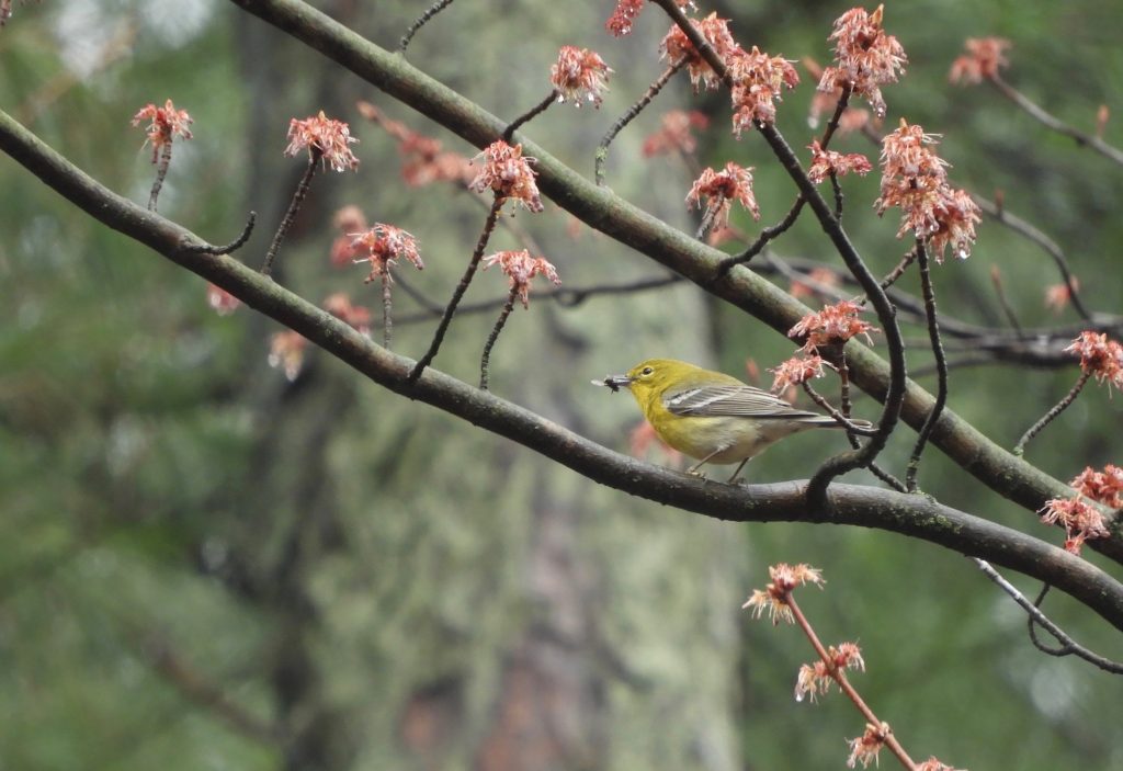 Making my way through a forested area, notable for a large grove of towering White Pines, there seemed to be bird sounds all around. Many familiars like: American Robin, White-breasted Nuthatch, Hairy Woodpecker, Brown Creeper and some quite mystifying, little call notes and fragments that made no sense to me. And strangely, I thought, the short dryish trill of a Pine Warbler. But if credible, it came from rather a long way off so was easy to discount this early in April. Pine Warbler is one of the first warblers to arrive in spring; but not yet, more likely in another ten days or so.