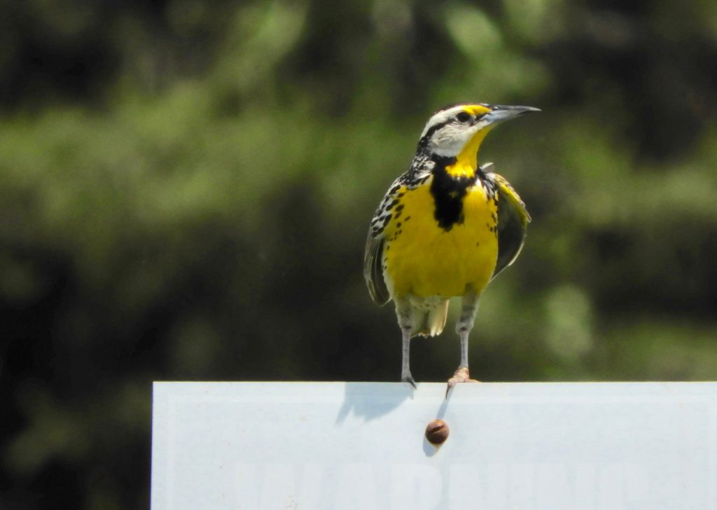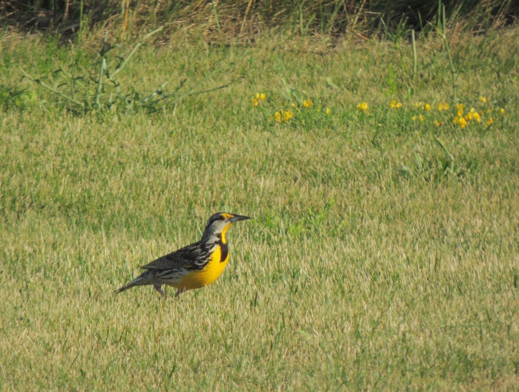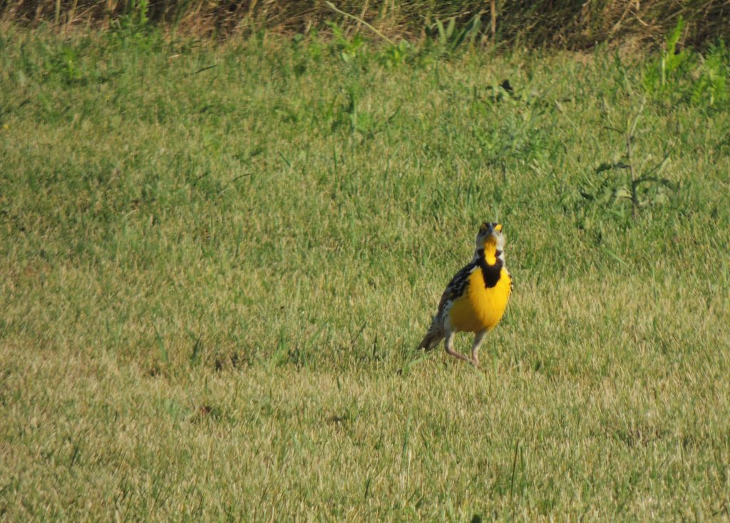 Something was different today, perhaps I was less conspicuous sitting in the shade; whatever the reason, an Eastern Meadowlark was my lucky-find Bird of the Day. It landed not twenty metres from me and spent a few minutes walking stiffly on the short-mown grass of the model airplane landing zone, picking for food and stopping every few paces to sing its melodic ‘spring-of-the-year’ song, a way of asserting his territorial rights. I was able to busy my camera and managed a few shots.