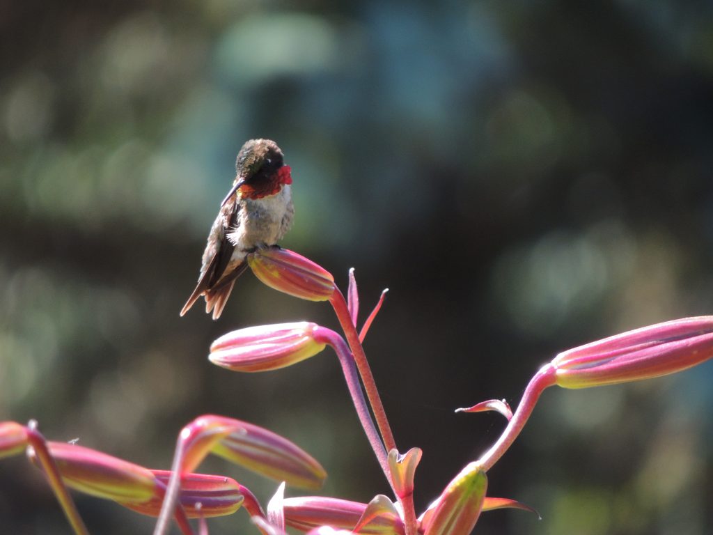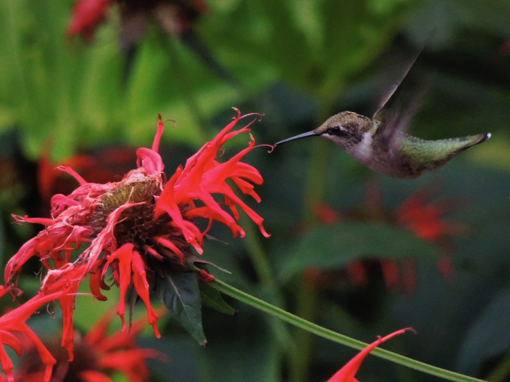 A few minutes later, a Ruby–throated Hummingbird paid a visit to our small patch of scarlet Bee–balm or Monarda didyma. Hummingbirds favour red flowers and it’s a frequent, if usually fleeting, visitor. I had a reasonable line of sight and the bird stayed fairly steady in its hovering but my camera and I, as a team, were non-existent . To be fair to the camera, it did what it was instructed, but my instructions were all wrong and I ended up with half a dozen pictures either way out of focus, over-exposed or hopelessly under-exposed. This photo below was taken six years ago at the same patch of Bee-balm.