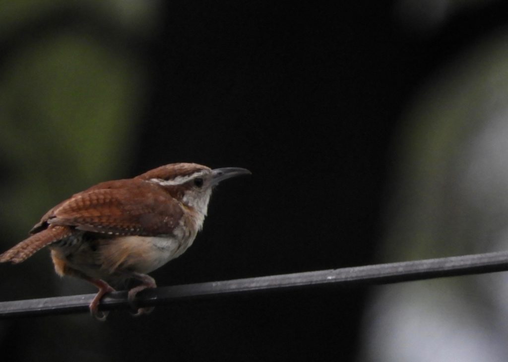 Back home, digesting breakfast in my colourful back yard, I thought it would be good practice to have binoculars and camera at hand; I was right. An out of sight but nevertheless close Carolina Wren starting belting out its I’m-in-charge territorial song. I don’t think Carolina Wren know any way of singing other than loud; while they can purr and mutter softly to themselves, their song is for broadcasting and is always delivered at full-volume. After a few minutes, it moved into my line of sight, perched on a wire, nicely lit, nicely positioned and with a clean background; perfect for a photo. I pointed and clicked off two pictures, the second one just as it flew; for my troubles I got one barely acceptable picture and one empty one. I could have done better, the camera and I were not quite the team I wish for, still, this is it. Not a great photo.
