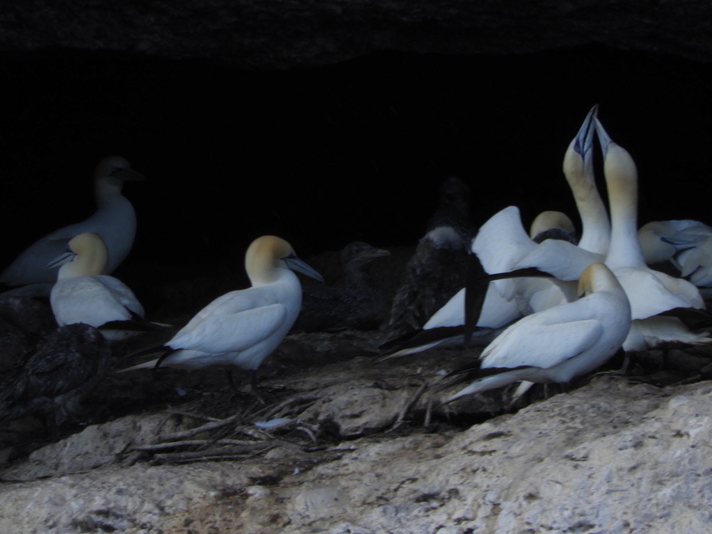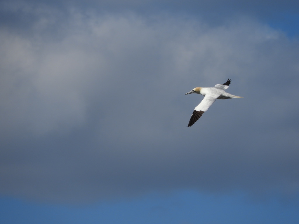 Northern Gannets’ breeding range is limited to the continental shelf waters around Quebec, Newfoundland, Iceland, Scotland and Norway, they wander far and wide from there feeding from the North Atlantic. They are a good-looking bird by any measure made for flight and fishing: larger than any gull, snow white overall with black wingtips and an apricot coloured head. They have the proportions of a glider, long of wing and slender of body, built for riding the steady winds of open waters and for managing steep cliff-faces. As far as I could tell they stick to open waters and either don’t, or wont, fly over the slightest scrap of dry land.