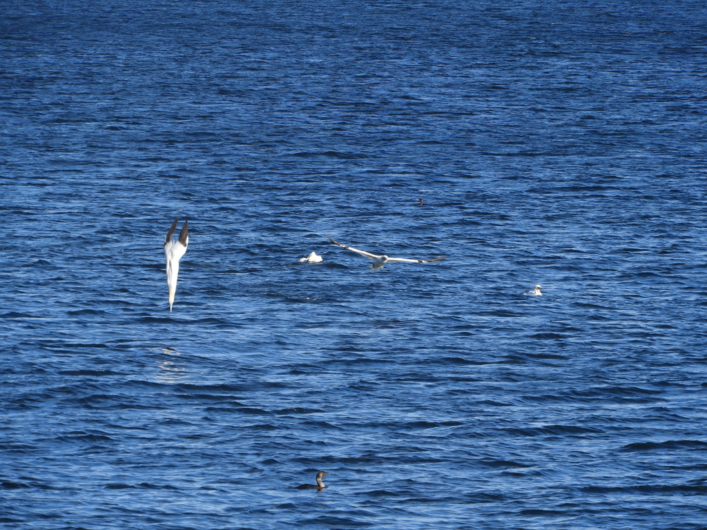I read that they hit the water at up to 100 km/hr and sometimes do break their necks if they aren’t precise on the entry. They start their dive from 30 m high but can fall the first 24 m in one second! That dive gets them a few meters under the surface and then they must propel with wings &/or feet to go deeper, up to 15 m. I’m also amazed that they catch and swallow fairly large fish underwater before surfacing. I’m glad I’m not a Gannet – cooking dinner is work enough for me! 🙂