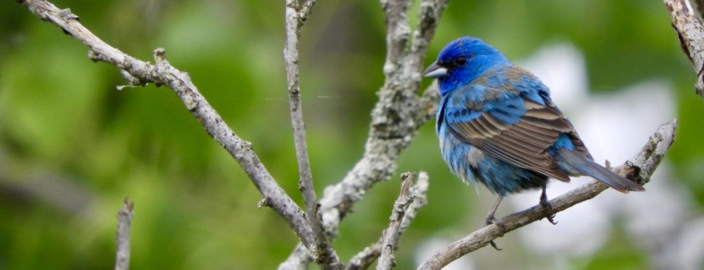 This day was cool, not a cloud in the sky, but a buffeting easterly wind made it chilly at times. The wind noise was distracting. I had reached the half-way point in this circuit, a stretch of path where deciduous woodland lays against a municipal playing field. The breeze in the trees made it impossible to spot any conspicuous bird movement but a nearby male Indigo Bunting flew up to a tree top, hopped from spot to spot briefly, grudgingly allowing just me enough time for one photograph. In the bird of the header bar you’ll see the blue brilliance is still emerging from dull brown as his spring moult completes.