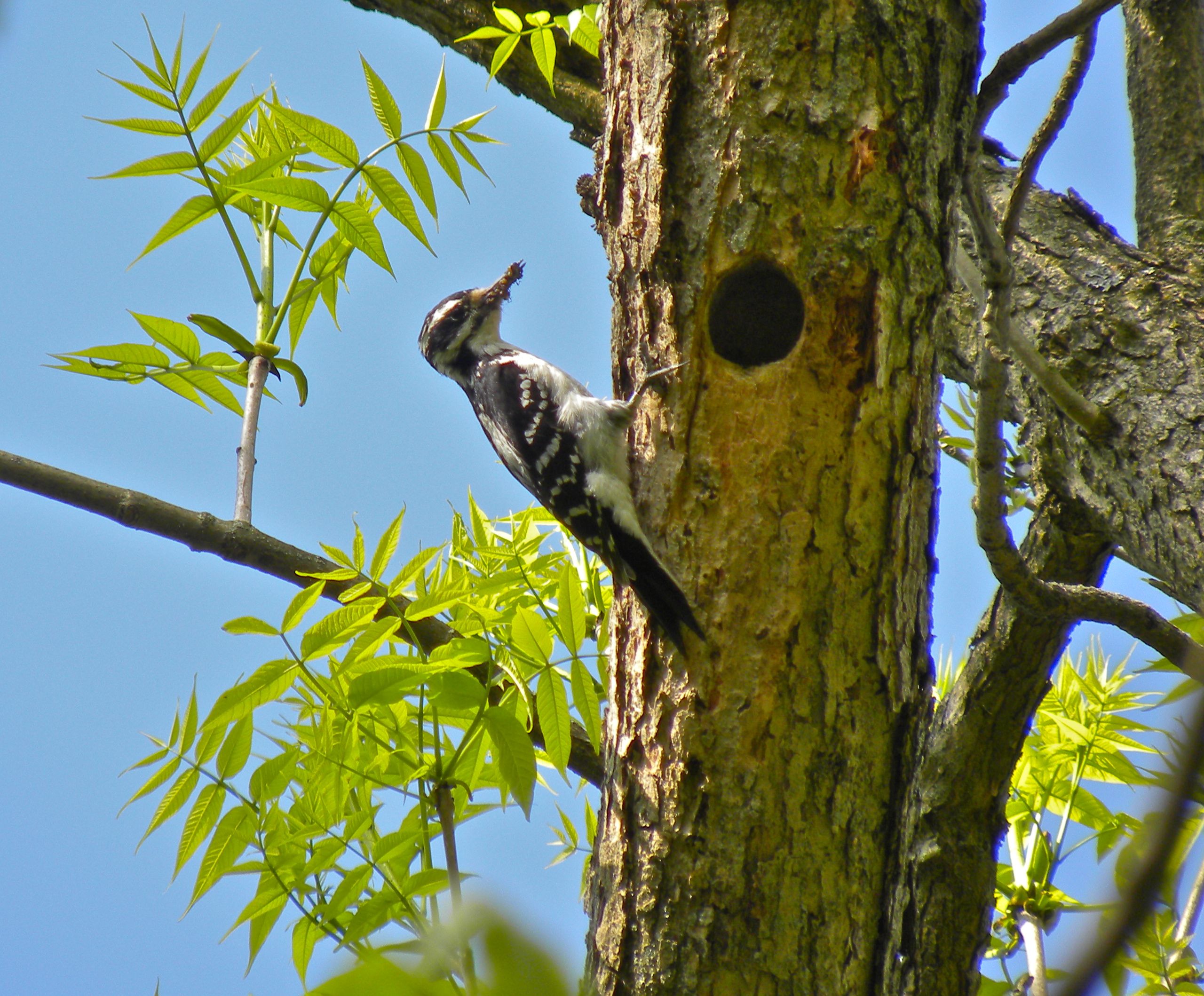 female Hairy Woodpecker carrying food for her young
