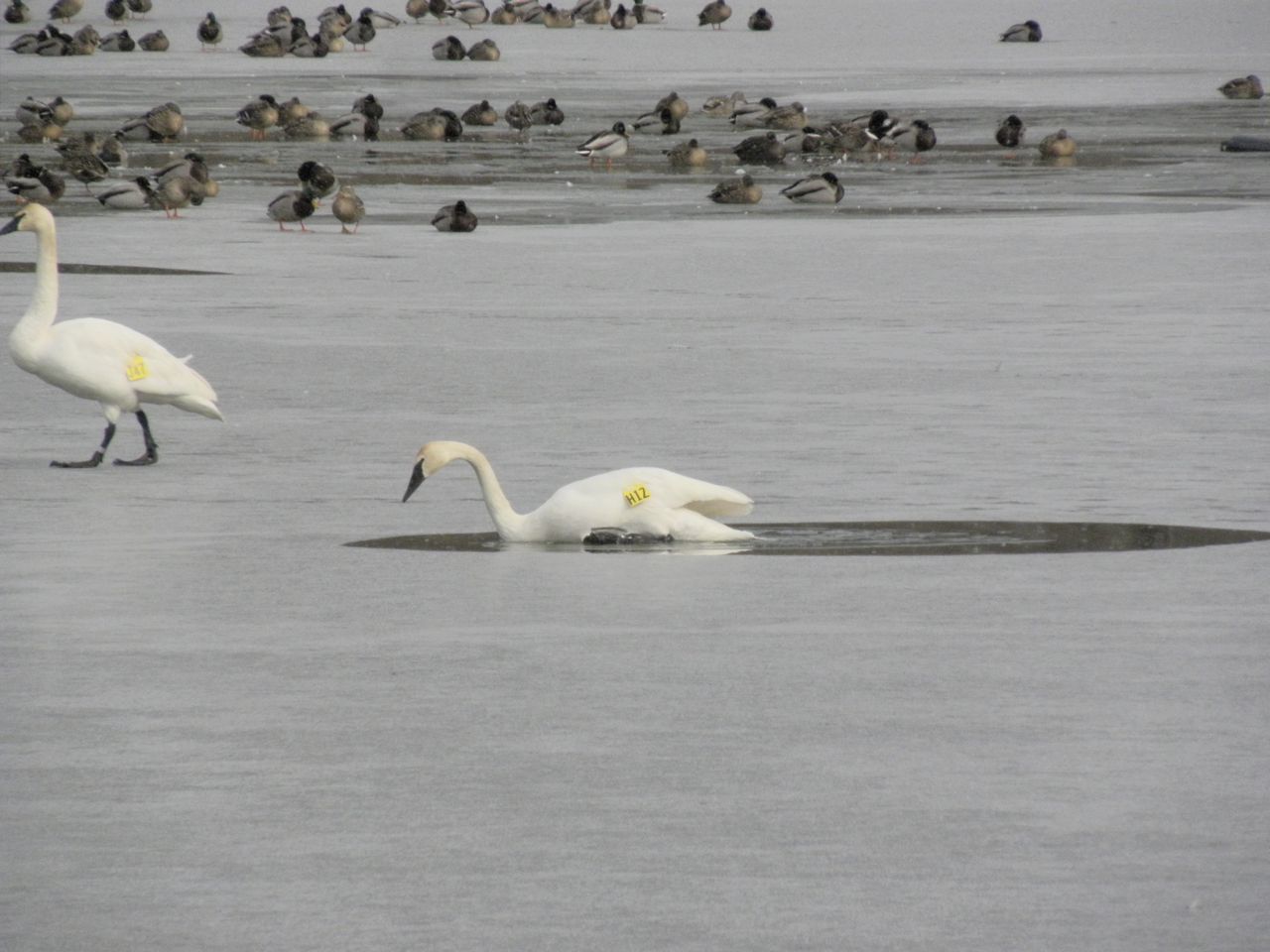 Next Image Trumpeter Swan stuggling to get out of the water and back onto the ice. LaSalle. Feb 16 2013 Trumpeter Swan struggling to get out of the water