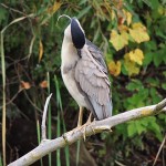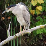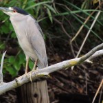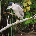 Today’s Bird of the Day, an adult Black-crowned Night Heron, was perched on a branch not 50 feet from me, I think it was waiting for me to leave. It was mid-day, well past bed-time for a nocturnal, or at least crepuscular, hunter of frogs, small fish and the like. Night herons can be hard to find during the day, but if you check carefully in the inner branches of pond-side trees you’ll sometimes spot them hunkered down at rest and anywhere up to about 50 feet above water level.