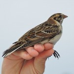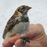 Lapland Longspurs are smaller and have a diminutive charm of their own. Like the buntings, they nest in tundra far above the tree line but spend the winter foraging over open fields in southern Canada and much of the U.S. It’s a privilege to see them after they’ve gone to all that effort to visit us. Few birders notice them because they can be so hard to find in those large flocks of Snow Buntings. The one that surrendered itself for banding was much admired, enough to be Bird of the Day.