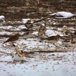 Snow Buntings, they are so aptly named, move in very large rolling flocks that barrel across the landscape like a loose-leafed snow squall. Horned Larks and Lapland Longspurs seem to get caught up in the excitement of the buntings’ wanderings and we’ll usually see a few of them, and maybe band a handful. (Click on any photo below to really appreciate their cuteness.)