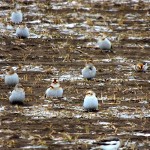31 January 2014. Haldimand ON. Thank goodness, a thaw. With temperatures just a shade above freezing for a change, I saw several noteworthy species today: Three Wild Turkeys picking through snow-encrusted corn stubble; a lone male Northern Harrier quartering wind-blown farm fields; a Rough-legged Hawk keeping watch atop a large oak; Tumbling squalls of Snow Buntings; A scattering of Horned Larks and, Bird of the Day, two or three Lapland Longspurs.