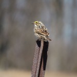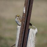 While I sat in my car watching the sandpipers, a Savannah Sparrow stopped atop a fence post in front of me and obligingly posed. He even squeaked out a few phrases of Savannah Sparrow song, “Tsit tsit tsit tsit tsit tseeeeeiii ur.”