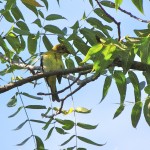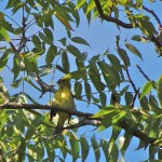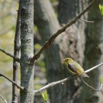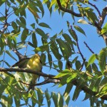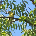 Anyway, back to Bird of the Day. Also high in the tree tops was a yellowish-green bird actively preening itself. It hurt my neck trying to hold still and watch it, my inclination was that I was watching a Yellow-throated Vireo, a choice that was reinforced by the call of another one off to my left. I used my camera to get several shots of it and thought that I could comfortably double-check my identification a little later, somewhere less awkward and involving less neck pain. Identification from below can be a challenge. Well, the upshot of all of this is that, on reviewing the pictures, it became clear that it was not a Yellow-throated Vireo at all (and photographing thank goodness) but rather another Scarlet Tanager, probably a female. The rather stout beak, a slight fork in the tail and the extent of yellow underneath from throat to tail were indicative. The yellow on the underside of a Yellow-throated Vireo is limited to its breast, and then it’s white from belly to tail. As I said above, there’s always something new to learn and for the instructive moment the tanager was my Bird of the Day.