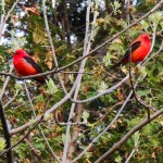 15 September 2014. Cayuga ON. Last year, around this time, while doing the daily census at the bird observatory, I took long-distance photos of a couple of mystery birds. They were both high up and hard to get really good looks at. Still my photos were passable so I posted them on a local birding site and asked for others’ opinions. The consensus was that they were both of Scarlet Tanagers, either males in non-breeding plumage, or females, or juveniles. You see, while identifying and appreciating a male Scarlet Tanager in May or June is easy, the same cannot be said for late summer and fall when all of that glorious red-hot scarlet has given way to a drab olive green; now the males look like the females and juveniles. Here’s a couple of shots to illustrate.