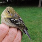 The Pine Warbler because it took a while to identify, perhaps because we don’t see them often. They are, as their name suggests, a bird that favours pines, and the observatory is surrounded by hardwood forest. Below is a photo of another Pine Warbler taken a year ago, probably a mature male showing all field marks. The one we handled today was a young female with absolutely none of the bright yellow about it. It was a very drab muted olive-yellow below, its back grayish brown, the wing-bars very subdued, the partial eye-ring whitish and that little line above and between the beak and the eye almost invisible. Even Rick, who knows his birds better than almost anyone I’ve met, was hard pushed to identify it, spending some time scouring the pages of the Peterson Field Guide to Warblers looking for a likely match.