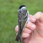 Birds of the Day came right at the end when we captured and banded two Blackpoll Warblers. Blackpoll Warblers can be tricky to identify in fall, the conspicuous black and white dress of spring, moults to a rather non-descript, easily confusable, olive green and muddy white with wingbars. Here are a couple of photos to illustrate the contrast.