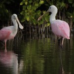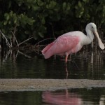 Best sighting, and truly a wow moment, was a pair of placid Roseate Spoonbills. While I have seen the European Spoonbill in Holland and had some idea of what to expect, it doesn’t compare to this, its American cousin. The European Spoonbill with its spatulate bill is something of a head-turner, but it’s really just another large, white, heron-like thing standing in the water. Since a picture’s worth a thousand words, I hardly need describe the Roseate Spoonbill. What made these birds special was not only our surprise at finding them, but also the gift of a setting with the dark mangrove background framing these blushing birds. I spent a long time on my knees in the foreground sludge watching and clicking. Here are a couple of my best shots.