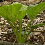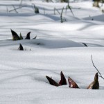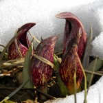 Our Hoary Redpoll came near the end of our hike. I spotted it while scanning a still largely frozen patch of mosses, woodland debris and tree roots. We were looking for any Skunk Cabbage spears that might have emerged through the ice and snow. Skunk Cabbage when full-grown looks vaguely like a large, bright-green, blowsy cabbage and its crushed leaves smell very musky. It is in the very large arum family of plants (along with Jack in the Pulpit, Cuckoopint and Calla Lily) and has the curious ability to use chemical means to generate sufficient warmth to melt its way through lingering snow and get a start on spring. Its rather introverted and hooded flowers appear long before its leaves just as soon as the first spike has pulled itself up out of the frozen ground. We look for in late March because, if nothing else, it’s a welcome sign of spring.