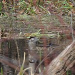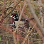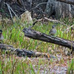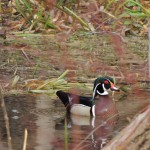 I found twenty-one Wood Ducks today, mostly males. I suspect a balancing number of females were preoccupied in their nest holes and incubating this year’s brood. Wood Ducks are distinctive for several reasons and foremost has to be the astonishing plumage of the male. It is a crazy collage of colours: maroon, bottle green, scarlet and cream; and shapes: crescents, slashes and curlicues. The female is no shrinking violet either. She doesn’t go for the exuberance of the male, instead she is a study in soft iridescence and eye make-up; no wonder he’s falls for her. I’ve included several photos of the couple in the gallery below. It’s interesting how, in the riot of spring colours and reflections, this pair quite successfully merge into the background; the female more so than the male. Nearby was another pair of Wood Ducks; each with its own log they watched me nervously. They were a pretty picture, so I’ve included them in the gallery (Visible only on the website, not if you’re reading this as an email.)