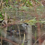 The Blue-winged Teals were my Birds of the Day. It is a species in decline, perhaps due to over-hunting on their wintering grounds. Formerly quite common during spring and summer, we don’t see them much any more. They pass through in the early spring (about now) and it always seems to be a brief visit. At a distance, the male is easy to identify with his white facial crescent and bum-patch. Closer up, the rich cinnamon of his breast and flanks puts him in the tasteful dresser category. This pair was hard to see working the dark edge of some old vegetation, then a passing Cooper’s Hawk panicked everyone but when everything had calmed down, the pair settled back in the open water close to where I could get this shot.