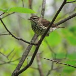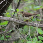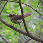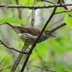 Today’s Birds of the Day and probably the commonest, were Northern Waterthrushes. Their habitat of choice is dense, dark and wet woodlands and, were they not so vocal and demonstrative, you could easily overlook them. They and their close relative the Louisiana Waterthrush, are nominally members of the warbler family but are not nearly as colourful as some of their supposed cousins. They make up for it with a spirited song that penetrates the swampy thickets and when in the slightest bit agitated, if for example they see you as threateningly close to their hungry nestlings, they flit overhead and around you, frantically chipping and bobbing their tail. One anxious waterthrush parent is never enough, before long the other parent will appear and then others apparently to lend noisy support to the protest. Other than the challenge of keeping up with them, it wasn’t too hard to get some good photos. But being obliging to the camera was in contrast to a handful of Canada Warblers who were also heard but only fleetingly glimpsed in those same wet brushy areas.