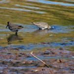 They were overall grayish though quite a bit lighter below and they were probing the mud deeply and rhythmically. Did that make them Dunlins? Or how about something less familiar? I started to review my mental who’s who of shorebirds when another, more experienced, birder joined me and confidently confirmed the Dunlin i.d. I suppose he made me feel better about my first-impressions identification. I wondered, should I have been more secure of myself with my first call, or is a bit of insecurity a good thing? The lesson learned was a reminder of the difference many species exhibit between spring and fall plumage: the former tending towards the flamboyant while the latter is more suitable for the office.