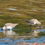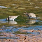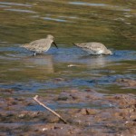 It was a little dull until someone pointed out a couple of small shorebirds working the muddy margins. I knew right away by the rather long downward-drooping bills that they were Dunlins. But then I started questioning myself. Why had I jumped to a conclusion? Other than their bills, they looked only similar to the Dunlins I’d seen in May. So biting back my hasty identification, I settled in to watch and examine them a bit more closely.