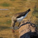 It was shortly after pondering the Dunlins that I found the Solitary Sandpiper. It worked its way towards us along a grubby shoreline, one on which I certainly wouldn’t walk barefoot. In the picture immediately below, you can make out a bit, almost a vestige, of webbing between the toes. (You can enlarge the picture slightly by clicking on it.) At risk of confusing things, I point this out because, in the cases of both Semipalmated Sandpipers and Semipalmated Plovers, they too have this limited webbing on their feet and that is why they have the adjectival component ‘semipalmated’ as part of their common names. I’m just as happy the Solitary Sandpiper is called what it is, despite its feet. Actually, solitary is a very good descriptor, I don’t think I’ve ever seen more than one, maybe two, at a time and all the books agree that they usually travel alone or in small groups.