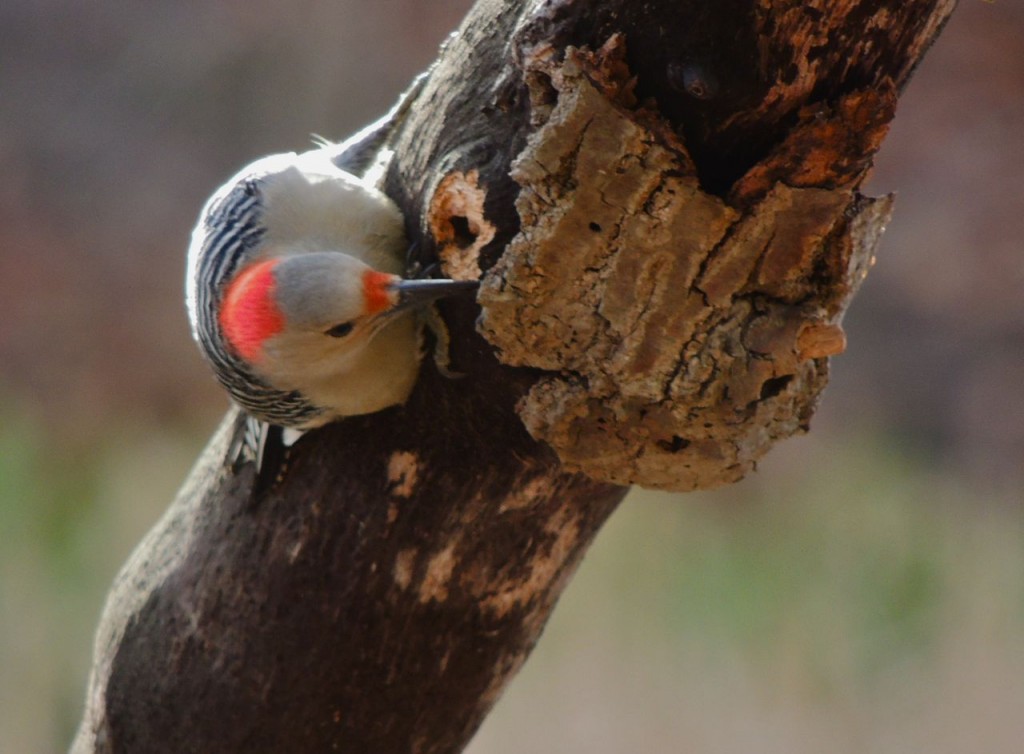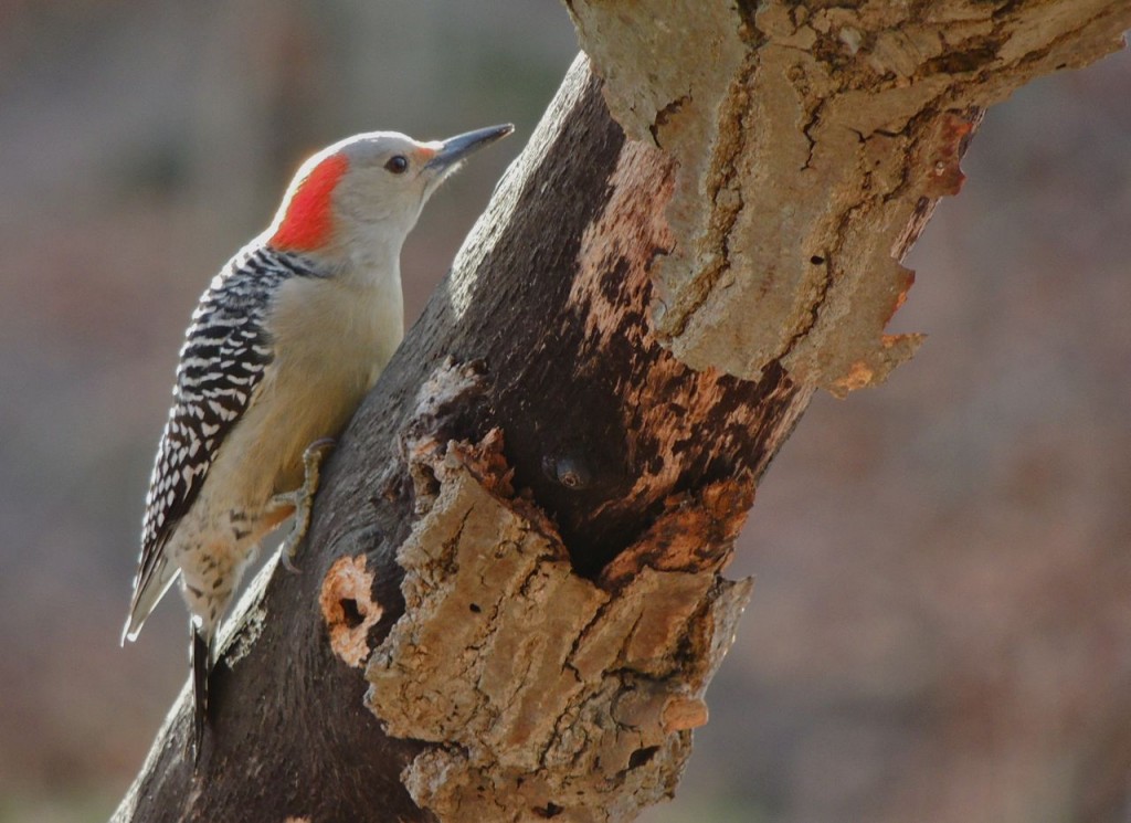 This female Red-bellied Woodpecker came close and allowed a good study of the distinguishing female plumage. On a male the entire crown is scarlet from nape to bill whereas on the female, the scarlet is limited to the nape and nasal tufts, leaving a creamy grey forehead.Red-bellied Woodpecker 2