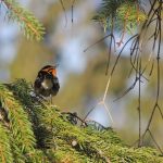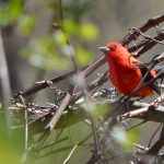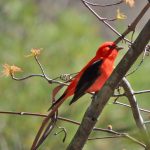 May 18 2016. Townsend Ontario. A day of many interesting sightings. Two of us completed a census taking three and a half hours to do what normally takes two. It was full of surprises and pleasures and we ended up with a list of fifty-eight species. Stand-outs in my view, although my companion Barry may have other ideas, were hearing many Tennessee Warblers, finding a neck-breakingly high overhead Blackburnian Warbler, two Cooper’s Hawks patrolling the area on languid wingbeats reminiscent of a Short-eared Owl’s floppy flight style, a female Wood Duck with a brood of eleven day-old ducklings and finding ourselves in close proximity to a male Scarlet Tanager. I have gushed about Scarlet Tanagers often enough but sometimes bemoan the fact that I find them difficult to photograph. Today’s was enjoyed by a gathering crowd of walkers and my camera did well to get some quite good photos; here are a couple. (In a gallery visible only on the website, not if you’re reading this as an email.)
